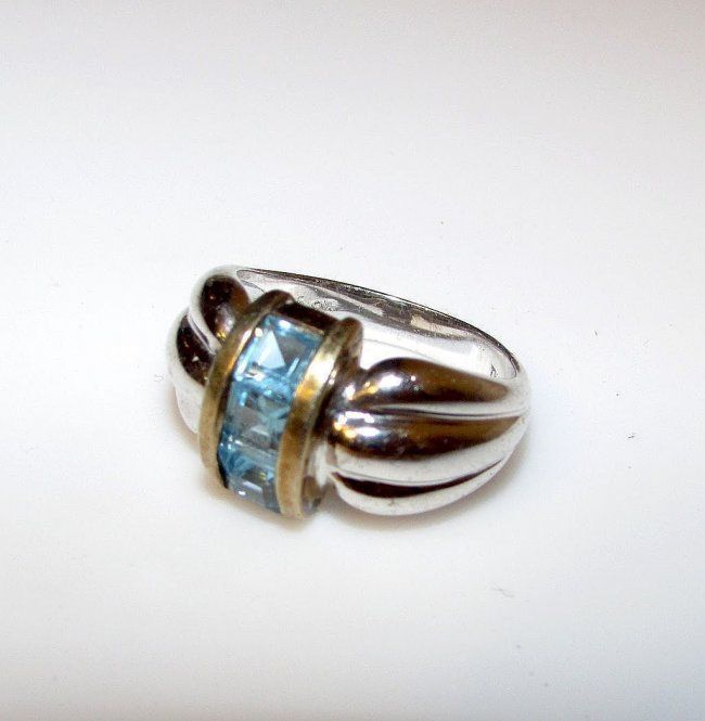 For your consideration is this fabulous vintage sterling silver ring with gold plated accents. This fabulous piece features an elegant design in sterling silver accented with sparkly blue topaz stones. The ring is size 7, marked "925" on the inside of the band.