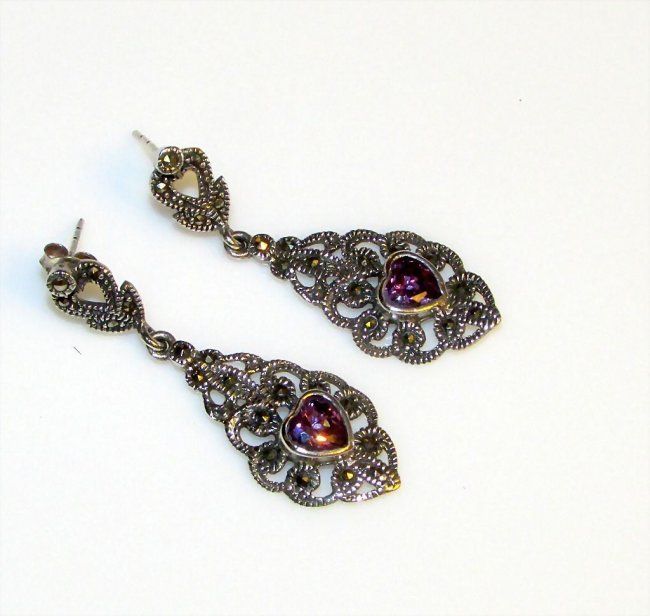 For your consideration is a pair of these gorgeous vintage sterling silver filigree marcasite pierced earrings in wonderful condition. These beauties feature an intricate filigree design in sterling silver accented with sparkly marcasite beads and faceted hear shaped purple amethysts. The earrings are a pierced type and measure 2" long. Stunning pieces. Marked "925" on the back.