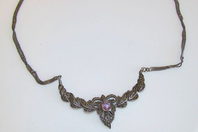 For your consideration is this fabulous vintage sterling silver marcasite and amethyst necklace in wonderful vintage condition. This gorgeous piece features a connected double chain design. The pendant part features an intricate design in sterling silver accented with sparkly marcasites that catch the light beautifully producing lots of sparkles. There is a beautiful faceted amethyst in the center. The necklace stamped 925 and measures about 16" long.