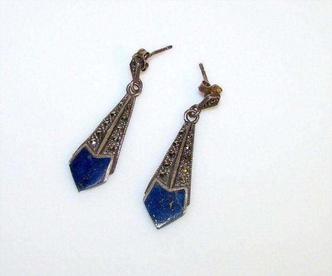 For your consideration is a pair of these vintage sterling silver pierced dangle earrings in wonderful vintage condition. These beauties are accented with sparkly marcasites and gorgeous genuine lapis lazuli. The earrings measure 1 1/2" long and are marked "925" on the back.