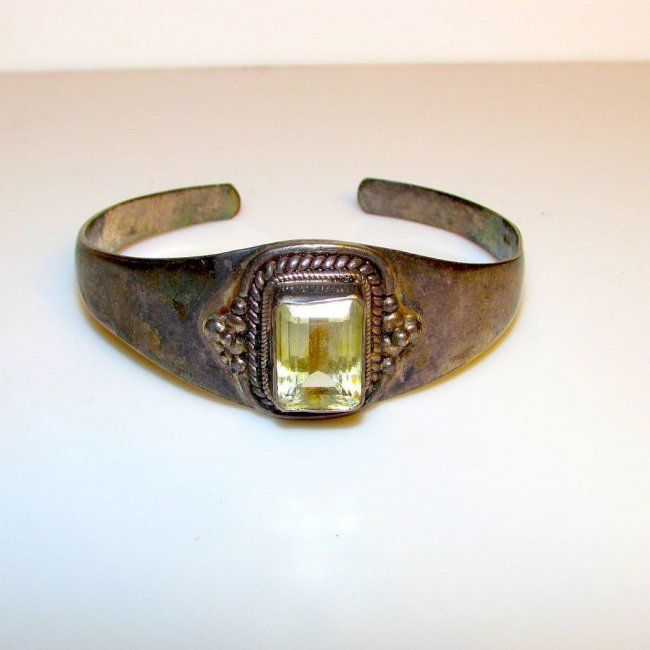 For your consideration is this fabulous vintage sterling silver citrine cuff bracelet in wonderful vintage condition. This beautiful piece features a classic design in sterling silver accented with an emerald cut yellow citrine. The bracelet measures about 1" wide and the inside circumference is about 7 1/2". The cuff can be carefully adjusted. Marked "925" on the inside of the cuff.