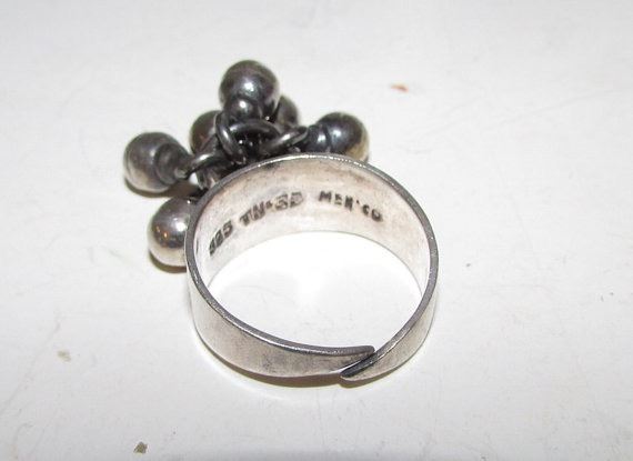 For your consideration is this fabulous vintage sterling silver Taxco dangle adjustable statement ring in wonderful vintage condition. This gorgeous piece features a unique design with dangles on the front in sterling silver. Marked "925" and "Mexico", and hallmarked TN-30, the ring has been tested for silver content. Set to size 8.5 but is adjustable and can fit smaller or larger sizes. Fabulous, unique statement ring to add to any jewelry collection!