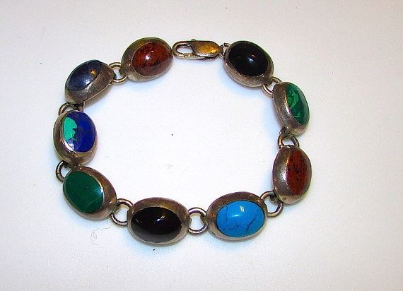 For your consideration is this fabulous vintage Mexican sterling silver 925 Taxco bracelet in wonderful vintage condition. This gorgeous statement piece features a classic link design in sterling silver accented with lapis, malachite, onyx, azurite, agate cabochons accents. The bracelet is marked "925" on the inside and is stamped "Taxco, Mexico". The bracelet has also been tested for silver content. Measures about 7 1/2" inside circumference by 1/2" wide. Weighs 38 gr. Colorful vintage jewelry to add to any collection!