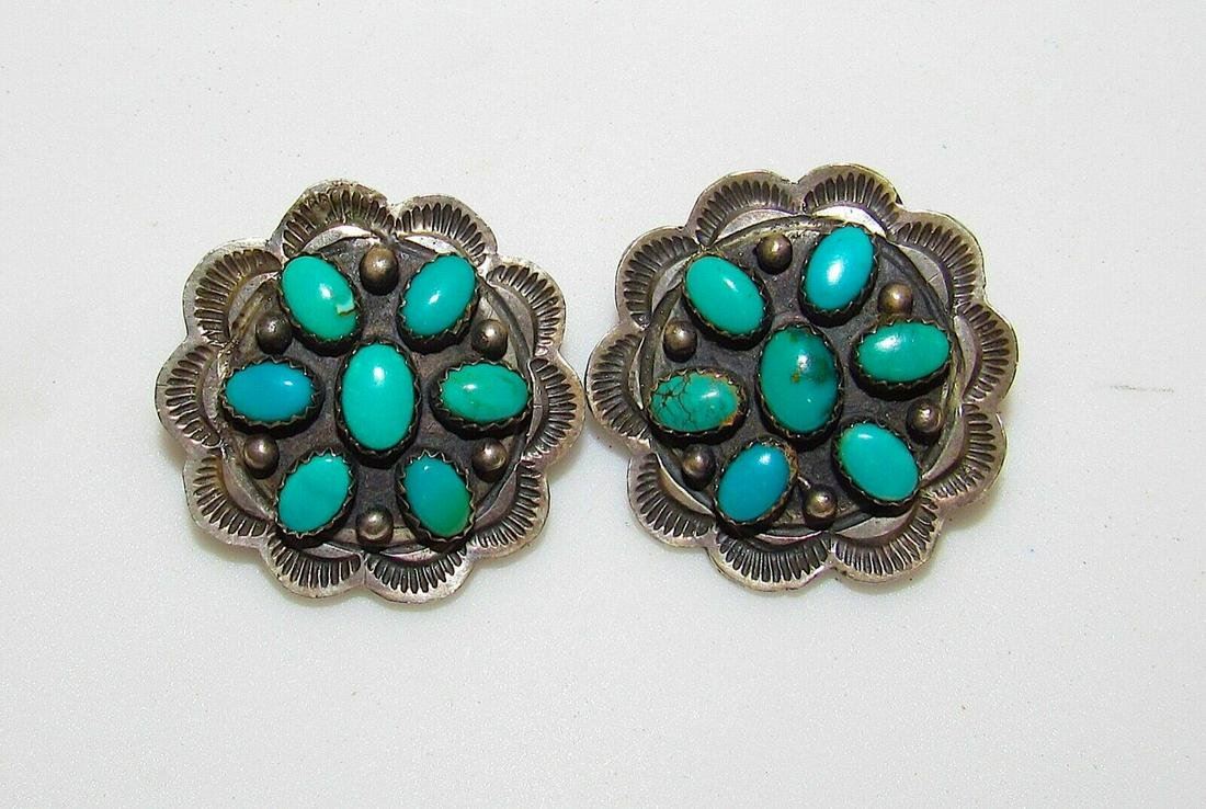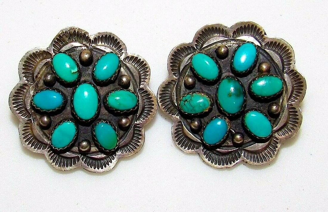 Phenomenal vintage Navajo sterling silver and turquoise cluster clip on earrings. The earrings measure about 1" in diameter and are a clip on style. Stunning craftsmanship and attention to detail. Gorgeous turquoise stones. Unmarked as most vintage Native jewelry pieces and has been tested for silver content. Fab authentic, vintage Native American Navajo clip on earrings to add to any jewelry collection!