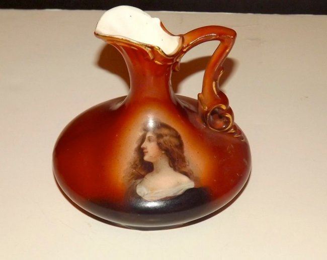 For your consideration is this fabulous turn of the century Austria porcelain vase/ewer. The vase is done is maroon color scheme and features a portrait of a young lady on the front. Golden accents on the top of the ewer and around the handle. No chips, cracks, repairs. Measures about 5 1/2" tall.