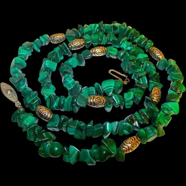 For your consideration is this vibrant green malachite necklace in wonderful vintage condition. This lovely piece offers a single strand malachite chip design accented with silver tone beads. The necklace measures about 26" long and is sure to make a wonderful and colorful addition to any jewelry collection.