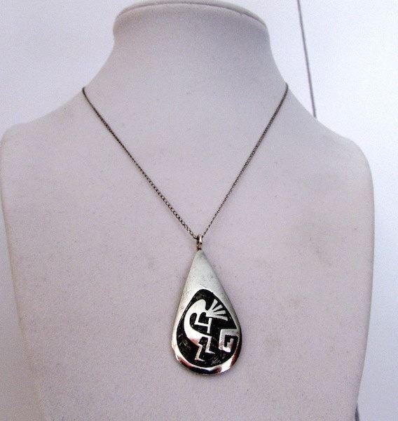 Stunning vintage HOPI sterling silver Kokopelli pendant on a sterling silver necklace by the highly collectible artist Norman Honie. The pendant features a traditional, hand etched Kokopelli design with high relief in sterling silver. Unmarked as most vintage Native American pieces and has been tested for silver content. Nice, heavy patina. Can be polished upon request. Measurements" 2" by 1" pendant including bail, 19" necklace including pendant Condition: Good Vintage Condition