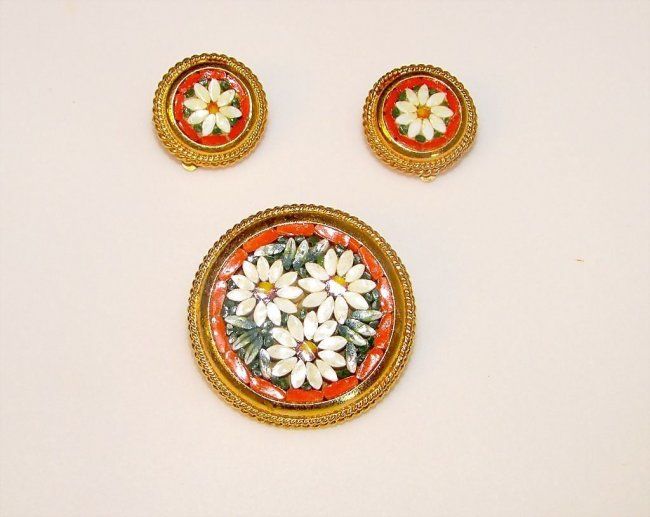 For your consideration is this gorgeous vintage Italian micro mosaic brooch and clip on earrings in wonderful vintage condition. This colorful set features intricately inlaid floral design. The brooch measures 1 1/4" in diameter and the earrings measure about 3/4" in diameter. Marked "Italy" on the back. A fabulous addition to any jewelry collection!