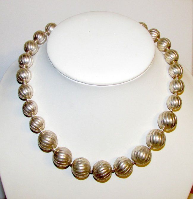 For your consideration is this fabulous vintage Italian sterling silver necklace in wonderful vintage condition. This gorgeous piece features a graduated bead design accented with etched swirls. The necklace measures 20" total length and comes with an extender so the length can be adjusted. The sterling beads size vary from 1/2" to 3/4". The necklace is marked "925" and "Italy" and weights 53 gr. An elegant piece to add to any collection.