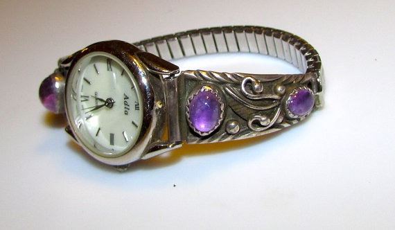 For your consideration is this exquisite vintage Navajo sterling silver and amethyst watch band with watch by the highly collectible Navajo artist Robert Becenti. The watch remains in wonderful condition. This exceptional piece features an intricately hand etched squash blossom design in sterling silver accented with 2 gorgeous amethyst cabochons on each side. Exceptional attention to detail in this fantastic piece, rare opportunity to acquire this beauty. The watch band comes with the watch. The watch is in great condition, the battery will need to be replaced. Marked "sterling" in the back and stamped with the artist's hallmark "RB". The watch is adjustable and is about 1" wide at the widest point. Superb addition to any jewelry collection!