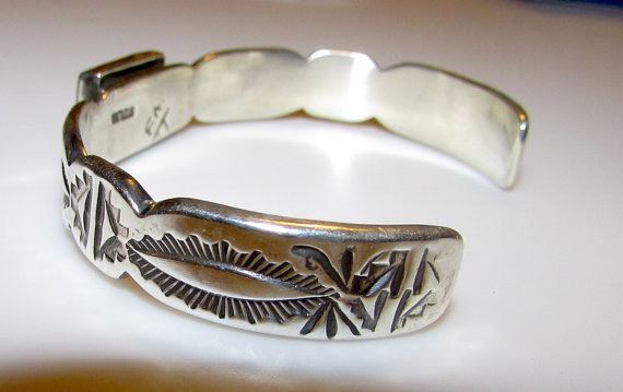 For your consideration is this fantastic example of vintage Native American art. This superb bracelet features a unique, intricately hand etched, traditional tribal Navajo design in sterling silver. The cuff is accentuated with a gorgeous and very unique Blue Diamond mine turquoise cabochon with gorgeous matrix. The piece is marked sterling and signed by the artist. The bracelet is over 1/2" wide and the inside circumference is about 6 1/2". The cuff can be carefully adjusted. Stunning addition to any collection!