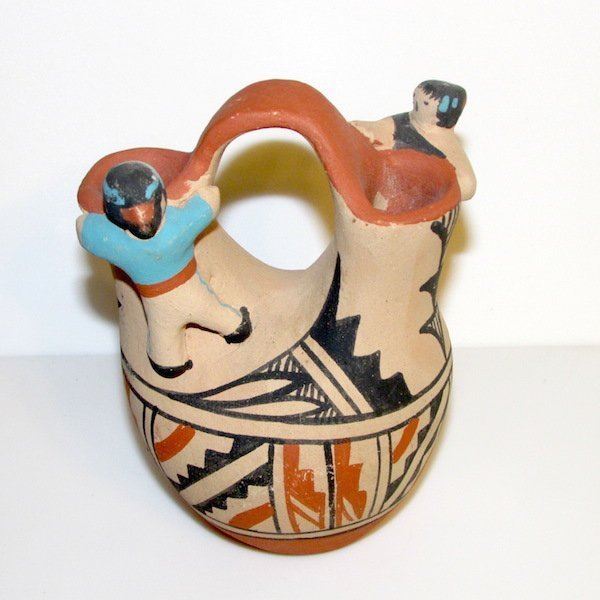 Vintage Native American Pueblo Pottery Wedding Vase circa 1960s. This wonderful piece feature a unique design with fantastic bride and groom representation figurines on each end to commemorate the wedding day celebration. A very special, rare and unique piece from 1960s to add to any collection! Marked VC and Jemez on the bottom. Measures 5" tall by 4 1/2" wide. No chips or cracks, some age appropriate finish wear.NO BUYER PREMIUM.EASY IN HOUSE SHIPPING.