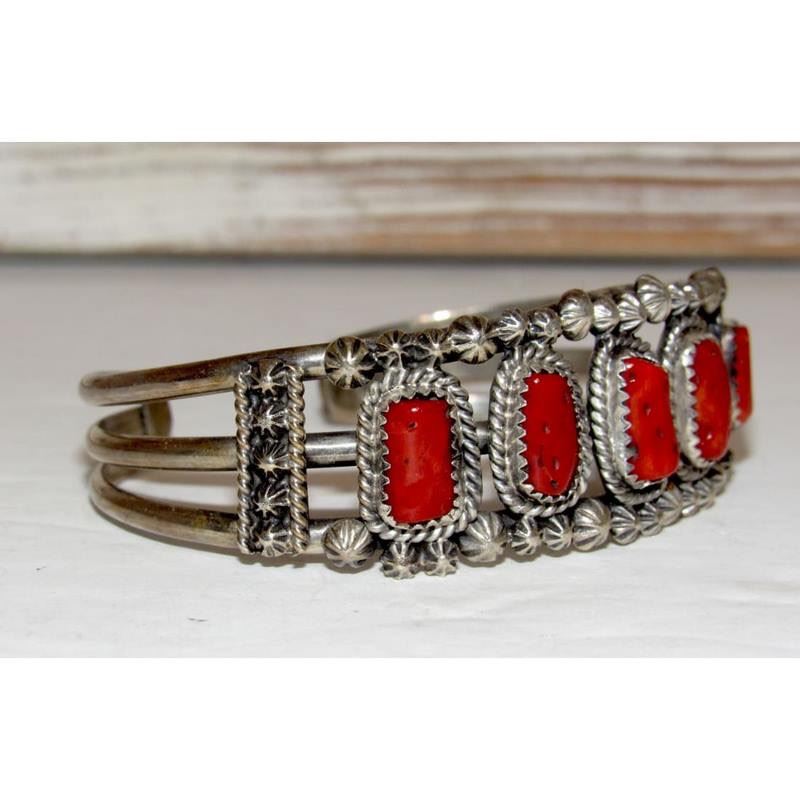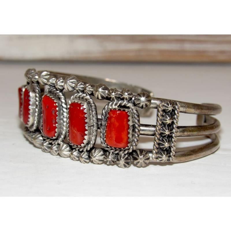 Vintage Navajo Mediterranean Coral Cuff Cluster Bracelet Sterling Silver