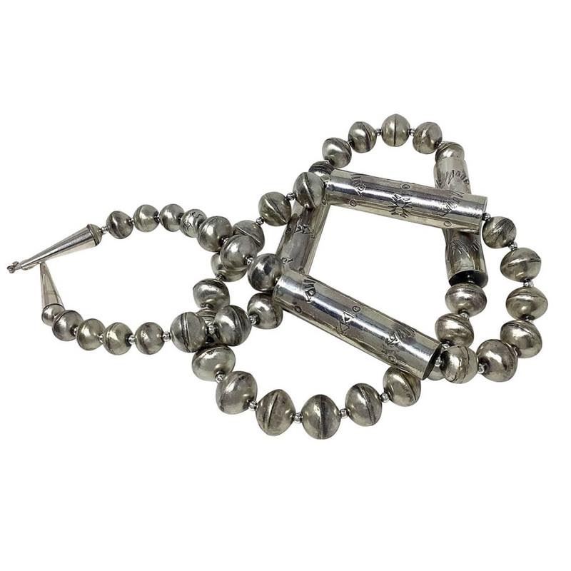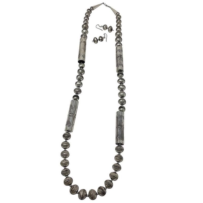 Phenomenal vintage Navajo pearls necklace and earrings. Hand etched design, hand made saucer & barrel beads, all hand strung. The set comes with a matching set of earrings . The necklace measures about 30" long and features sterling cones and a hook/eye closure. The earrings feature a classic bead design with french wire hooks. The set weighs about 82g. Stunning collectible timeless authentic Navajo necklace and earrings set, add a pendant or wear by itself.