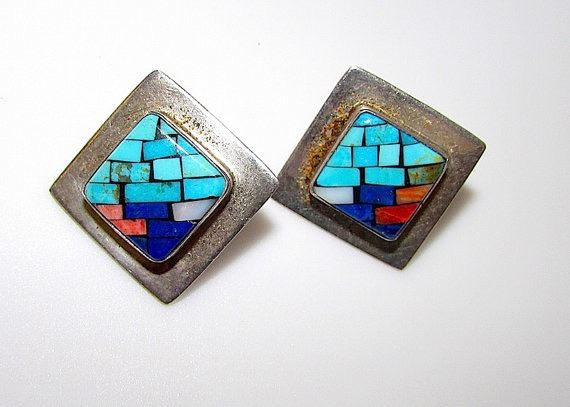 For your consideration is a pair of these exquisite vintage Navajo sterling silver, turquoise, coral, jet, MOP channel inlay pierced earrings in wonderful vintage condition. The earrings feature a geometric design in sterling silver, accented with channel inlay turquoise, coral, jet, MOP inlay. Marked "sterling" and stamped with the artist's hallmark. These stunning statement pieces measure 3/4" wide by 3/4" tall. Superb beauties to add to any jewelry collection!