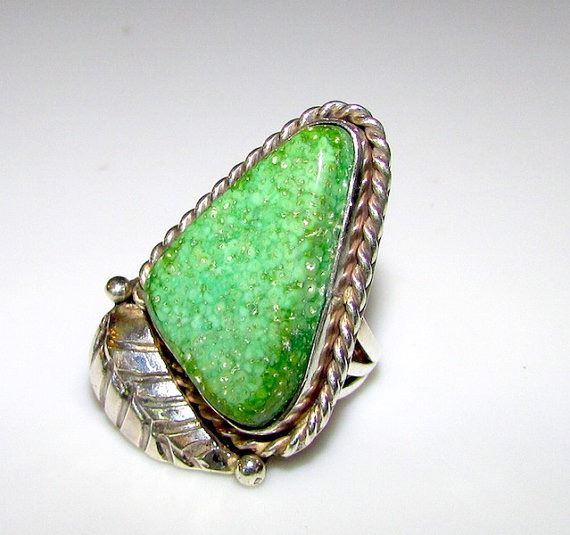 For your consideration is this outstanding Old Pawn Native American Navajo sterling silver Carico Lake mine turquoise ring size 6 in nice vintage condition. This fabulous ring features a traditional Navajo squash blossom design in sterling silver accented with exquisite, green turquoise cabochon with gorgeous matrix. The ring is unmarked as all vintage Native American jewelry and has been tested for silver content. The ring is size 6. The front of the ring measures 1 1/4" tall by 1" wide at the widest point. Stunning example of vintage Native American art to add to any collection!