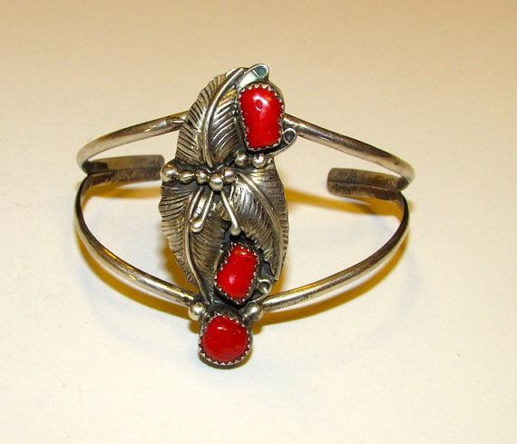 For your consideration is this stunning vintage Navajo sterling silver and Mediterranean coral squash blossom cuff bracelet in wonderful vintage condition. This elegant bracelet features a fantastically detailed traditional squash blossom design in sterling silver accented with three gorgeous coral cabochons on the front. The cuff measures 2" wide at the widest point and the inside circumference is about 7 including gap. The cuff can be carefully adjusted. The piece is unmarked as most Ola Pawn Native American jewelry and has been tested for silver content. Superb addition to any jewelry collection!