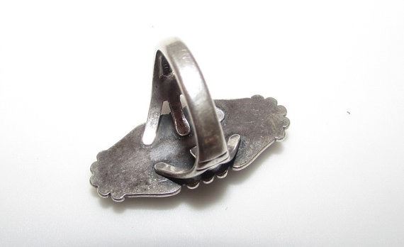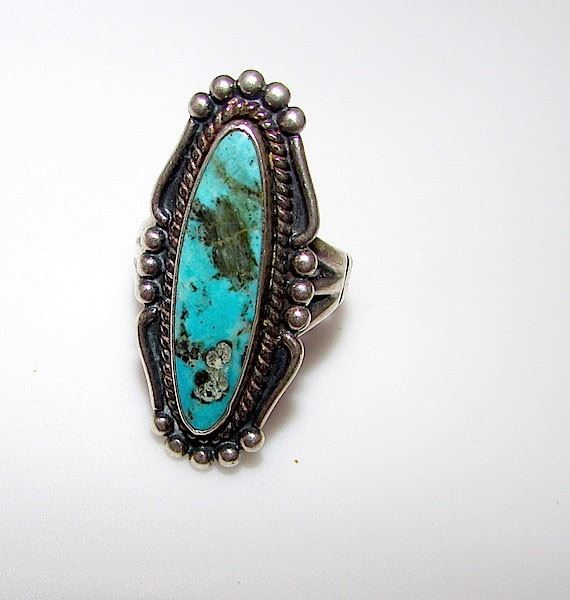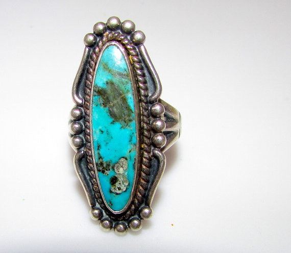 For your consideration is this outstanding Old Pawn Native American Navajo sterling silver Southwestern mines turquoise ring size 6 in nice vintage condition. This fabulous ring features a traditional Navajo design in sterling silver accented with exquisite, blue turquoise cabochon with gorgeous matrix. The ring is unmarked as all Old Pawn jewelry and has been tested for silver content. The ring is size 6. The front of the ring measures about 1 1/4" tall by about 1/2" wide. Stunning example of vintage Native American art to add to any collection!