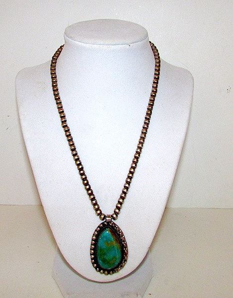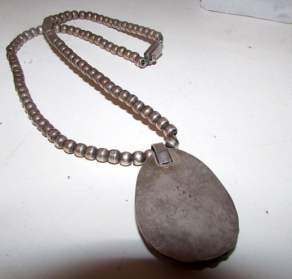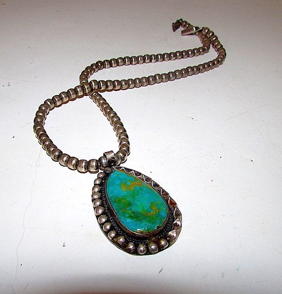 Specacular Old Pawn Navajo Sterling Turquoise Necklace in wonderful condition. Superb, heavy silver statement piece. Marked sterling. 22" long, pendant about 2" long by 1 1/2" wide. Stamped with the artist's hallmark. The pendant measure 1 1/2" tall including bail by 1 1/4" wide. no damage to the stone, weighs 62 grams. Very impressive piece. The clasp is "push in" type and works well. Stunning collector piece to add to any vintage jewelry collection!