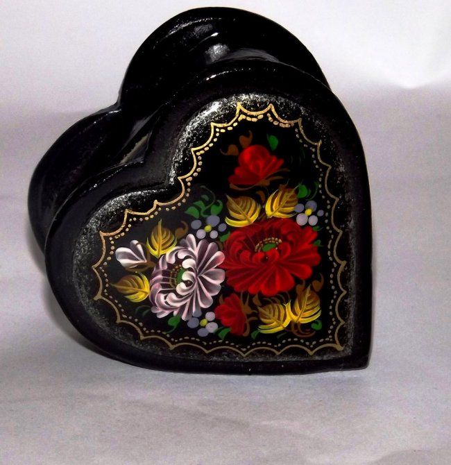 For your consideration is this gorgeous vintage Russian lacquer miniature box in mint condition. The box features a unique heart shape and a gorgeous floral decor. The box displays beautifully with no wear and measures about 2 1/2" long by 2 1/4" wide. A fabulous gift or addition to any collection!