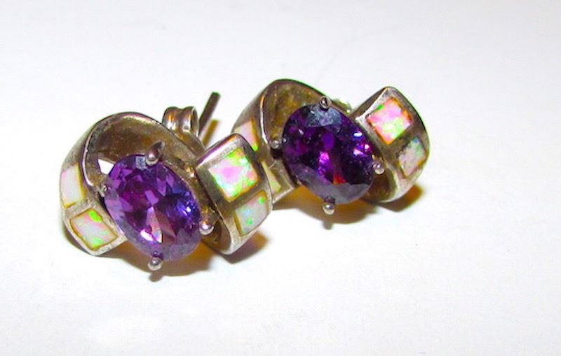 For your consideration is a pair of these exquisite vintage sterling silver, amethyst, and opal earrings in wonderful vintage condition. This wonderful pair features an elegant design in sterling silver accented with sparkly amethysts and opal inlay. The earrings are a pierced, post type and measure about 1/2" long. Marked "925" and have been tested for silver content. Fabulous addition to any jewelry collection!