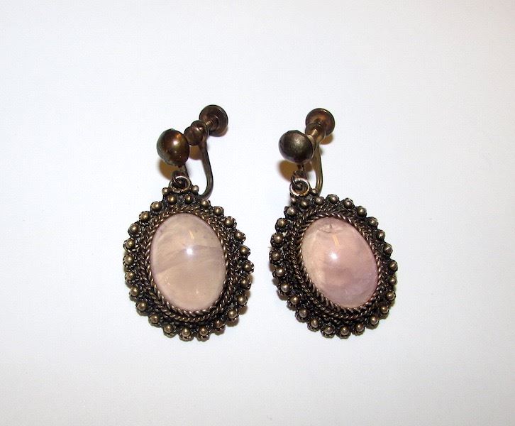 For your consideration is a pair of these fabulous vintage vermeil sterling silver and pink rose quartz dangle pierced earrings in wonderful vintage condition. This fabulous pair features an elegant design in sterling silver with vermeil finish, accented with romantic light pink quartz cabochons. Marked "925" and "Israel" on the back and measure 1 1/4" long by 3/4" wide. The earrings are a screw back type. Fabulous addition to any jewelry collection!