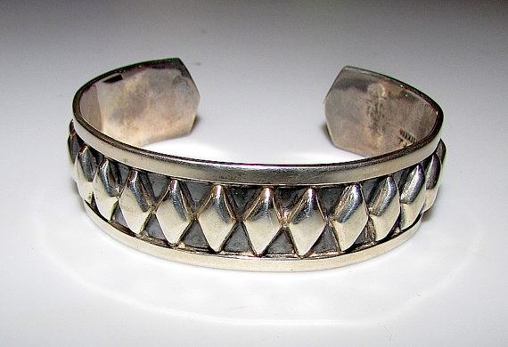For your consideration is this fabulous, vintage sterling silver cuff bracelet in wonderful vintage condition. This impressive Taxco piece features an intricate, hand etched design in sterling silver accented with southwestern design. The cuff weighs 37 gr, and measures 3/4" wide. The inside circumference is about 6 1/2" including gap and the cuff can be carefully adjusted. Marked "925", Mexico on the inside and is stamped with the artist's hallmark TJ-65. Spectacular piece of jewelry to add to any jewelry collection!