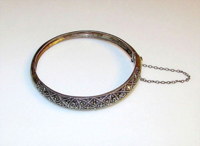 For your consideration is this gorgeous vintage sterling silver marcasite bangle bracelet with a safety chain in wonderful vintage condition. This beauty offers a detailed design in sterling silver and marcasites are all sparkly and intact. This elegant piece features a box clasp and safety chain and both closures work well. The bracelet is marked "925".