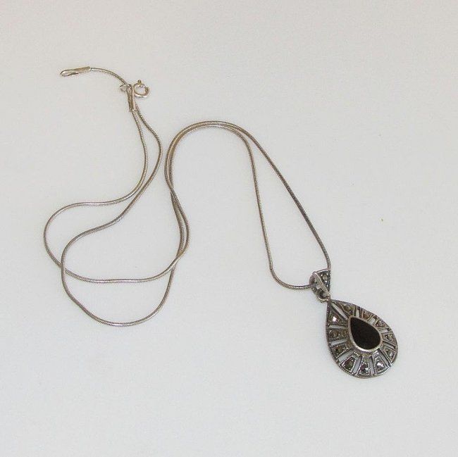For your consideration is this elegant vintage sterling silver marcasite pendant pendant necklace in wonderful vintage condition. The pendant features an elegant design in sterling silver accented with sparkly marcasites. The pendant measures 1 1/2" long by 3/4" wide at the widest point and the necklace is 20" long. Marked "925" on the back. A wonderful addition to any jewelry collection!