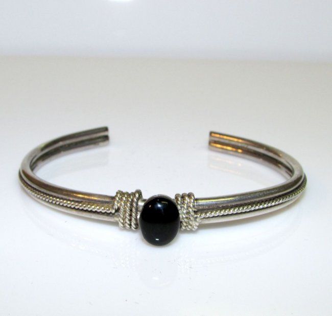For your consideration is this elegant vintage sterling silver onyx cuff bracelet. This beauty offers a classic and elegant design in sterling silver accented with an onyx cabochon. The inside circumference is about 7" and can be carefully adjusted. We have matching earrings available for your consideration. Please check out our inventory.