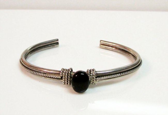 For your consideration is this elegant vintage sterling silver onyx cuff bracelet. This beauty offers a classic and elegant design in sterling silver accented with an onyx cabochon. The inside circumference is about 7" and can be carefully adjusted. We have matching earrings available for your consideration. Please check out our inventory.