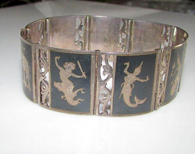 For your consideration is this fabulous vintage sterling silver Siam niello bracelet with filigree accents in wonderful vintage condition. The bracelet features elephant and goddess theme panels and measures about 1" wide by about 7" inside circumference. Marked "Siam" and "sterling". The clasp works very well.